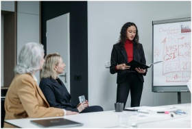 Three business women in a modern office holding a team meeting with presentations and discussions.
