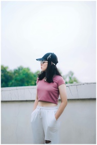 A woman in a pink crop top stands against a concrete wall outdoors in Cimahi, Indonesia.