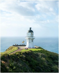 Scenic view of Cape Reinga Lighthouse in Northland, New Zealand, perched on a cliff by the sea.
