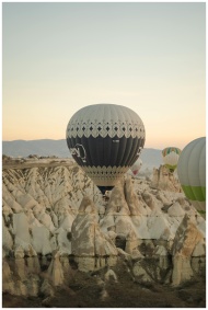 Captivating view of hot air balloons soaring over the unique landscapes of Cappadocia at sunrise.