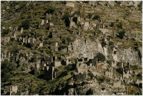 A striking view of ancient ruins cascading down a rocky mountainside.