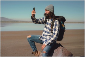 Casual man in trendy outfit takes selfie during outdoor adventure by a lake.