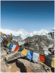 Vibrant prayer flags flutter amidst the majestic Himalayan mountains in Nepal.