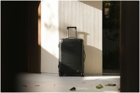 A sleek black suitcase stands in a sunlit hallway, capturing travel elegance and simplicity.