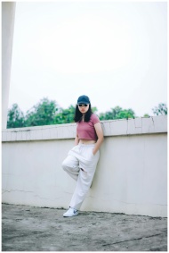 Fashionable woman poses in a crop top and trousers outdoors in Cimahi, Indonesia.