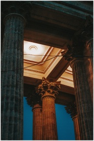 Majestic Corinthian columns lit up at twilight in Saint Petersburg, Russia.