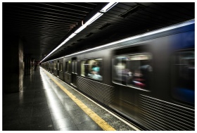Long exposure shot of a subway train speeding through a station in São Paulo.