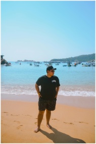 Casual young man standing on a sunny beach with boats in the background, enjoying the summer scenery.