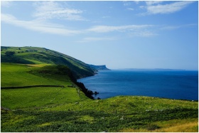 Vibrant coastal view featuring lush green hills and expansive blue ocean under a bright sky.