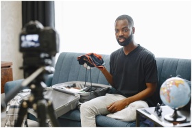 A vlogger records a travel vlog while unpacking a suitcase indoors with camera setup.