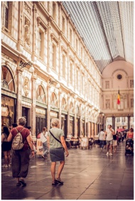 People exploring the historic Galeries Royales Saint-Hubert in Brussels, showcasing elegant architecture.