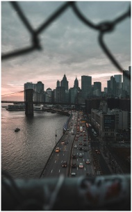 Captivating view of New York skyline and traffic at sunset, framed by wire fence.