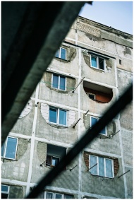 View of a weathered apartment building in Tbilisi showing urban decay and architectural detail.