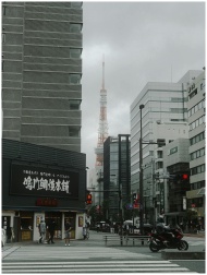 View of Tokyo Tower from the streets of Minato, ca