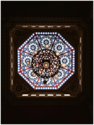 Intricate stained glass ceiling with chandelier in historical building, Rio de Janeiro.