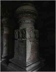A detailed view of an ancient stone pillar inside the Ellora Caves in Maharashtra, India.