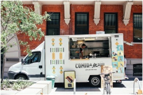White food truck serving Brazilian cuisine in city