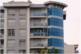 Contemporary apartment building facade with blue glass and balconies in Bornova, İzmir.