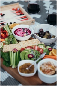 A colorful vegan picnic platter featuring hummus, olives, vegetables, and crackers. Perfect for outdoor gatherings.
