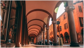 Stunning low angle view of a portico walkway with orange buildings in Florence, Italy, capturing Italian architectural elegance.