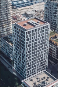 High-rise buildings in an urban setting captured from above, showcasing modern architecture.