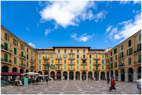 Sunny view of Plaza Mayor in Palma de Mallorca wit