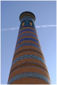 Looking up view of vibrant striped minaret in Khiv