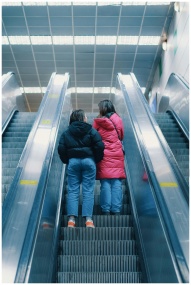 Two women in puffer jackets stand on escalators in