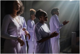 A group of African American singers performing in a sunlit church interior, creating a spiritual atmosphere.