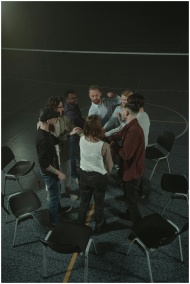 A group of adults engaged in a team-building activity indoors with chairs arranged in a circle.