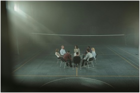 A group therapy session with participants seated in a circle inside a dimly lit gymnasium.