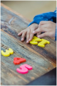 A child arranges colorful plastic numbers on a wooden table, aiding early math education.
