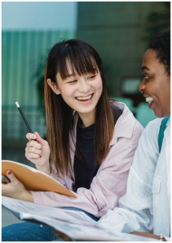 Young women studying outdoors, exchanging ideas and happiness in a collaborative learning environment.