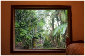 View through a window onto a lush tropical rainforest in Morretes, Brazil.