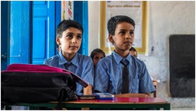 Two schoolboys in uniforms attentively listening in an Indian classroom.