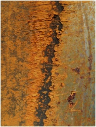 Detailed close-up of a rusty metal surface with peeling orange and black textures.