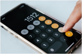 From above of crop faceless financier touching plus sign on screen of cellphone while using calculator application and calculating total amount