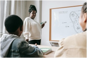 African American female teacher standing near whit
