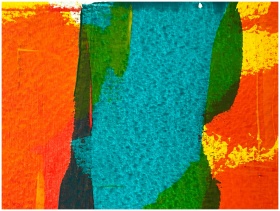 Colorful abstract painting with bold and vibrant brush strokes of blue, orange, and green.