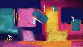 Bold and colorful abstract wall art with vibrant hues and dynamic shapes.