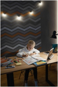 A young boy focused on his homework, using a tablet and surrounded by school books, in a cozy indoor setting.