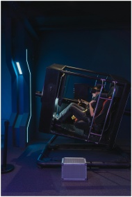 Person immersed in a virtual reality simulator experience, using a VR headset in a dark room setting.