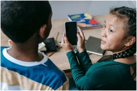 From above of adorable little Asian girl showing mobile phone to unrecognizable African American boy during break in classroom