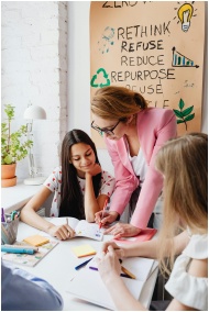 Students engaged in a sustainable project with teacher guidance, fostering learning and creativity.