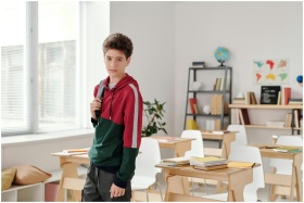 A teenage boy in a hoodie stands in a bright classroom holding a backpack.