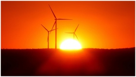 Stunning silhouette of wind turbines against a vibrant orange sunset, capturing renewable energy visuals.