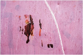 White and red lines and spots on surface of old shabby dirty pink wall in daylight