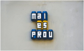 Creative wall art featuring cans spelling out words in bold colors.