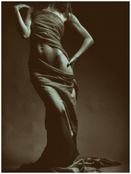 Artistic portrait of a female figure draped in cloth, captured in monochrome tones.