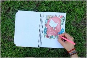 A hand drawing vibrant art in a sketchbook placed